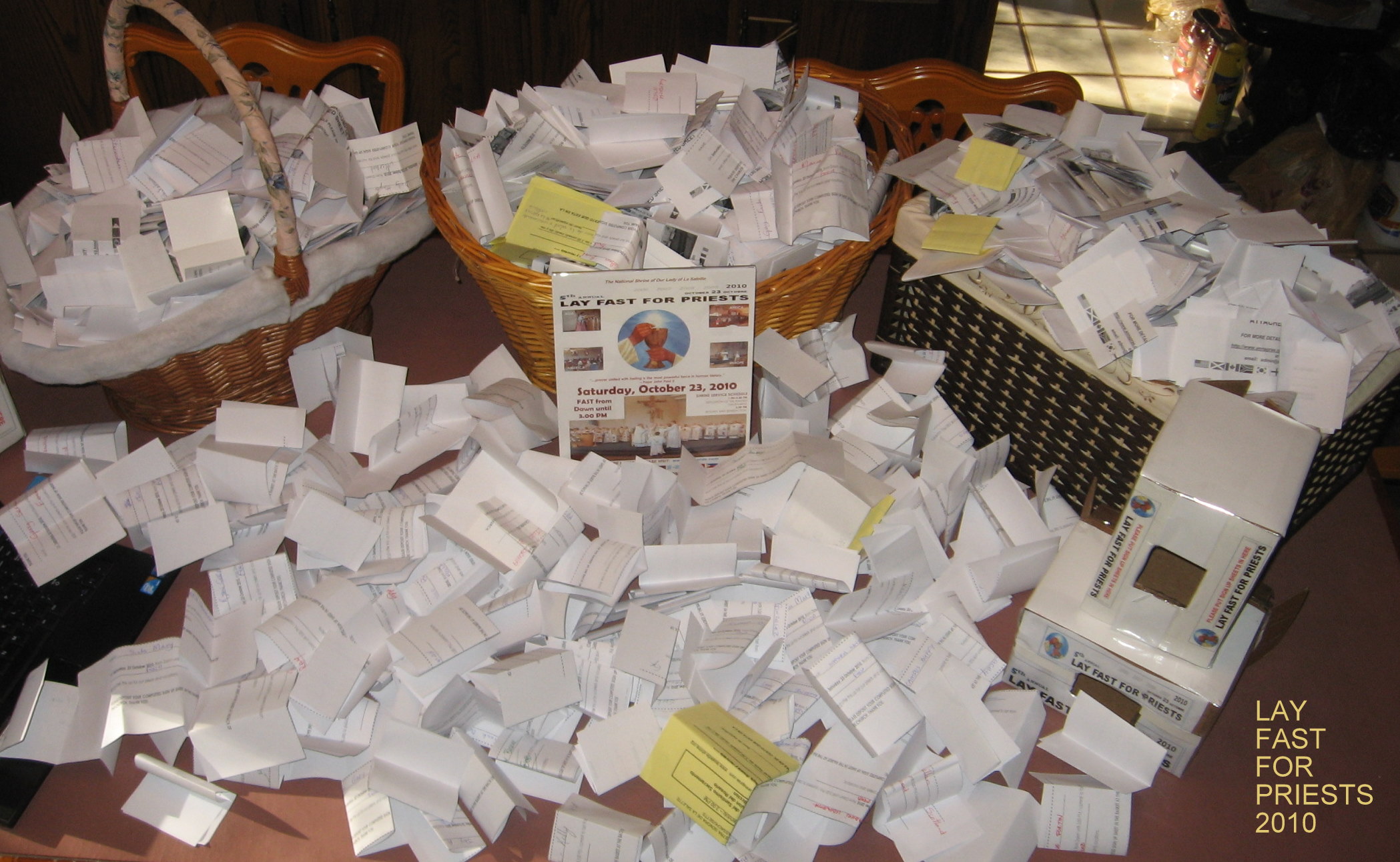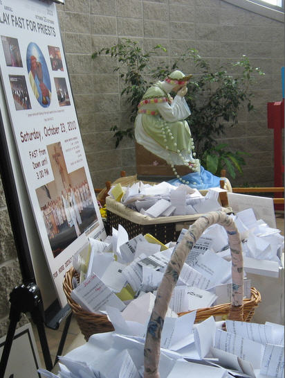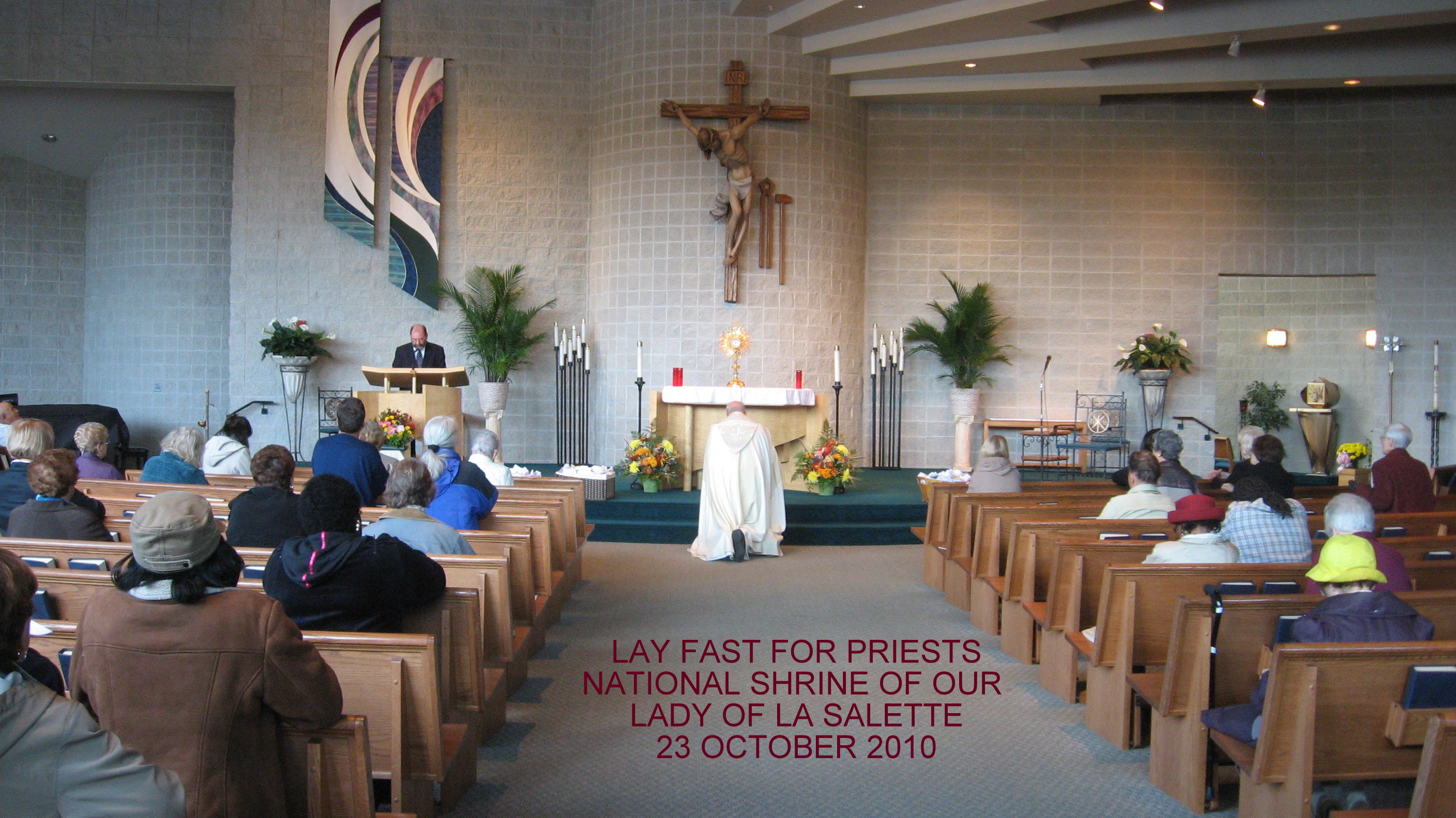 Dearest Friends in Christ Jesus, It is Sunday the 24th, the day after the fifth annual Lay Fast Day for Priests and it is with great joy that we thank Our Blessed Lady for this magnificent offering from the people of God. Thousands of folks from Australia and New Zealand all the way to Hawaii signed up to storm Heaven in this fast for priests. In the United States, Dina Marie Hale of KVBM FM Oregon and Drew Mariani at Relevant Radio in Milwaukee caused our email inbox to be flooded after they announced the Fast on their programs. Thanks to all of our new friends from Facebook and their extensive global networks, such as Michele in Michigan USA and Denis in Africa, our numbers were boosted even higher this year. Being aware of the many thousands who signed up at their own parishes throughout the world and whose names were not recorded, we named each participating parish so that all of us were in solidarity for such an astonishing offering in this global Fast to God for Priests. We, the Lay Fast team, also wrote the name of every online sign up and when the baskets of sign ups were processed to the Lord at our closing Benediction yesterday, we were all united in Him. One of our brothers in Christ in Australia emailed us on Friday our time to tell us that it was now Dawn for him; that he was on the early shift – and the he was already hungry!! It was going to be along day, he said, but it was worth it for our priests, signing off “G’Donya”. We have seen names of people in countries that were difficult for us to pronounce … Lavish from India; Sergei from Russia; David from HussIan Province in Siam; Pee Wee from Taiwan; not forgetting Gordon McPherson from Scotland. We have had warm wishes to all of us fasting here in the Americas and many funny wee comments like Bill from England who reminded me that when I was still hungry yesterday, he would be tucking into to a nice steak dinner! Or Joan from San Diego who wrote, “No TV for me. No way! All day!” And Vince from Quebec who expressed what the Fast means for all of us: “For all priests: past, future, present. WOW!!” We have had the heartbreaking offering from our Spiritual family in Christ who live in Aden where Catholics are being persecuted. They asked for our prayers as do our Spiritual brothers and sisters in China. Yesterday, all over the world from the Far East to the furthest West, many, many thousands of the people of God have united in a common Fast to petition Our Lady for Spiritual protection for all priests; for forgiveness for those gone by; for strength and holiness for those yet to be ordained. And to bless us, the people of God, with many more good and holy men who will lead every heart to Christ. This past week-end, here at the National Shrine of Our Lady of La Salette in Attleboro, Massachusetts we have actually witnessed that very possibility – fifteen young and fine men arrived for a “Come and See” weekend. Our Lady has seen and heard our sacrifice of the last five years of Fasts … and God has answered. We wish you continued and abundant blessings in the Lord and God willing, we may see you same time, same place, next year for the sixth annual Lay Fast for Priests – on Saturday, 22 October 2011! In Jesus Through Mary, Anna and the Lay Fast team |