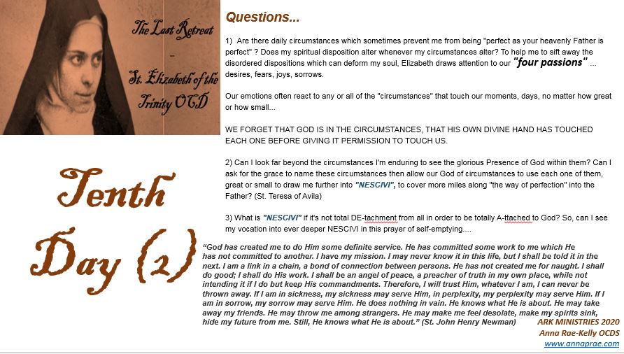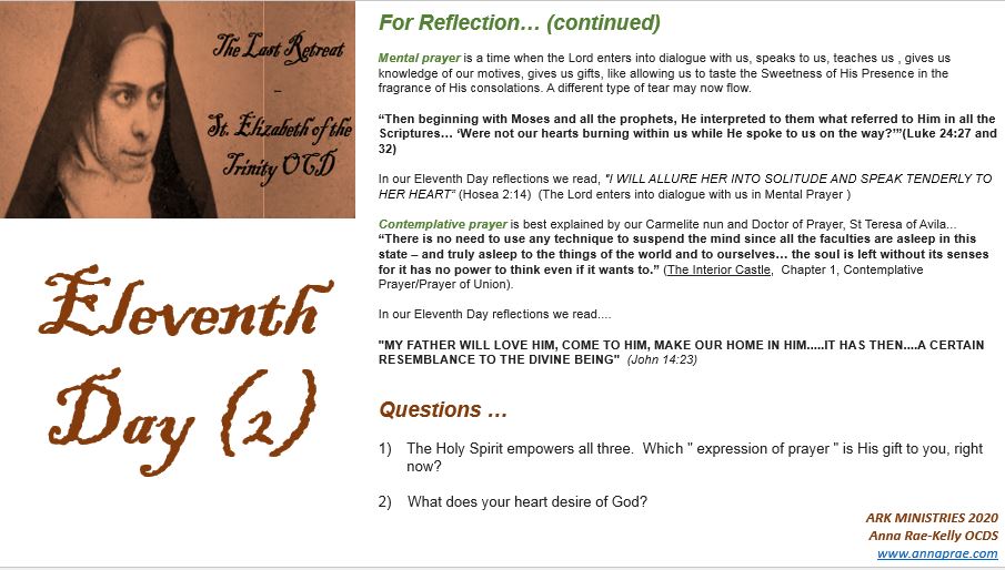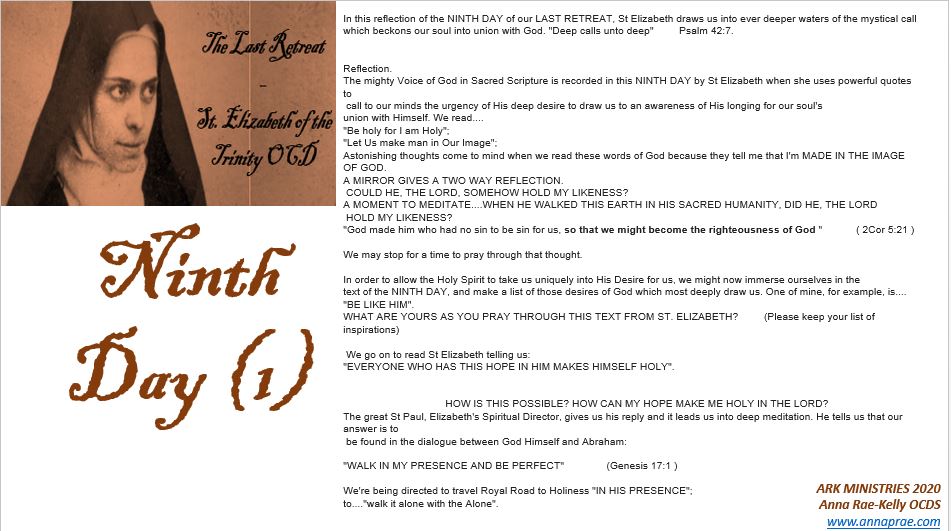 The Beckoning – Week One Prayer is the desire to seek God, to pursue Him. This very desire itself is from God … so, in seeking Him, our desire means we have already found Him. Prayer is a major threat to satan. In his letter to the Ephesians, St. Paul tells us that prayer reveals the works of satan. The Father told Catherine of Siena that prayer unwinds the bandages of self-love. St. Teresa of Avila reminds us that when we invite God to take up lodging in us He will always pay us generously for sharing our roof with Him. “How can we doubt that he will work miracles within us since He is in our home? His majesty never offers too little payment for His lodging if we treat Him well.” Way of Perfection, pg 224 The Beckoning – Week Two Last week we talked about being drawn into the silence of our souls through prayer – the place where God dwells. Seeking silence is not about seeking an absence of noise. It about seeking the PRESENCE of the Holy One within. To do this, to enter this interior silence, we spoke about going into solitude with God. Going into solitude is not the same as being in isolation, Isolation brings withdrawal and sadness. These are feelings that happen when we are lonely. Going into solitude with God means that we will have contact with Another. When we step out of our little desert, our solitude with God, we will be RESTORED. One effect of this is that our minds to go into wonder when we attend Mass and hear the language of this beautiful Sacrifice. We will no longer be spectators, we will be participants. The Beckoning – Week Three We are now at the midway point of our retreat. We move tonight with courage towards the all-important last Wednesday of our retreat before Holy Week and Easter when we will be silenced … WITH SHOCK AND AWE… at the revelations that we will now examine as we begin to look at the Source and Summit of our Catholic lives – the Most Holy Eucharist. To prepare us, we look this evening at the Beatitudes which are a call to become the anawim of God. In order to make us His anawim, God will use every circumstance in our daily lives to get our attention, to make us trust in Him alone. He allows us to learn hard lessons if we are His pre- destined ones, His children. He allows us to go into a sort of Spiritual boot camp. The circumstances which bring about trials cause us to ask: What has God taught me from failure? What has God taught me from lack of money? What has God taught me from pain or sorrow or depression? What has God taught me through waiting? What has God taught me through illness? What has God taught me from disappointment? The Beckoning – Week Four In Week One, we retreated to examine our weaponry in the battle to win souls, our own and others, for God. And our first week’s weapon was PRAYER. In Week Two, we looked for a worthy companion to walk with us as we try every new day to respond to the beckoning from God. And our eyes turned to Mary, the beloved daughter of the Eternal father, the admirable Mother of the Son and the Faithful Spouse of the Holy Spirit. This woman, who is the world of God, will teach us how to empty ourselves. In Week Three, we sought a roadmap for direction on the journey and we found the Beatitudes. Tonight, we will pick up a tool that was given by Our Lady to St. Dominic and which gives us strength in responding to the power of the Call. The tool is the Rosary. Tonight, we will use the Luminous Mysteries to enter into Mental Prayer guided by the Holy Spirit. The Beckoning -Week Five And when your heart resembles Mine, when you are drawn to prayer and come to Me, when you empty yourself of sinfulness, when you find Me in the silence and humbly listen to Me, when you allow yourself to be used and used up for Me, and be broken like Me so that others may live, when you unite yourself to Me in the Eucharist, THEN …