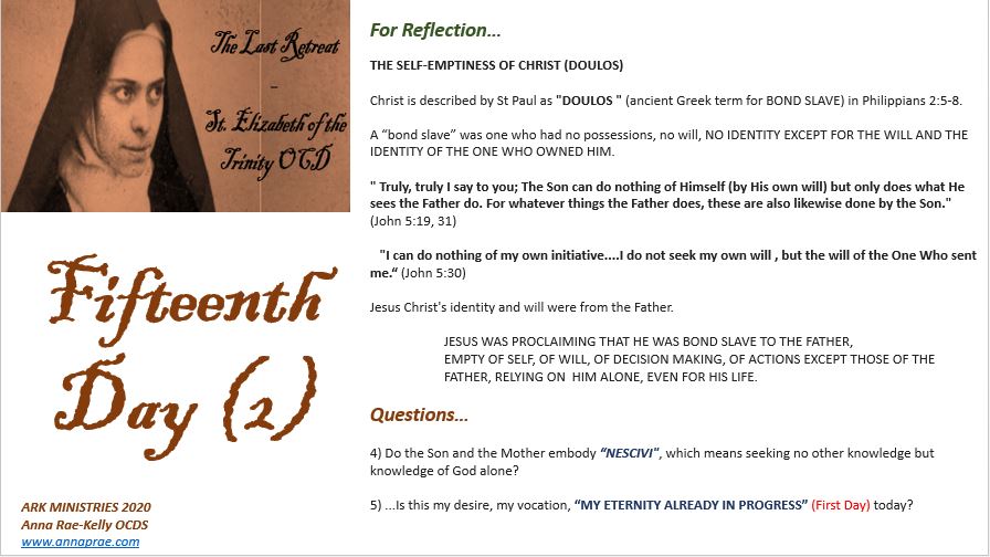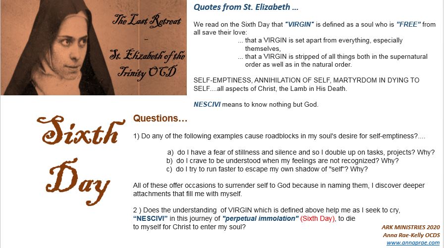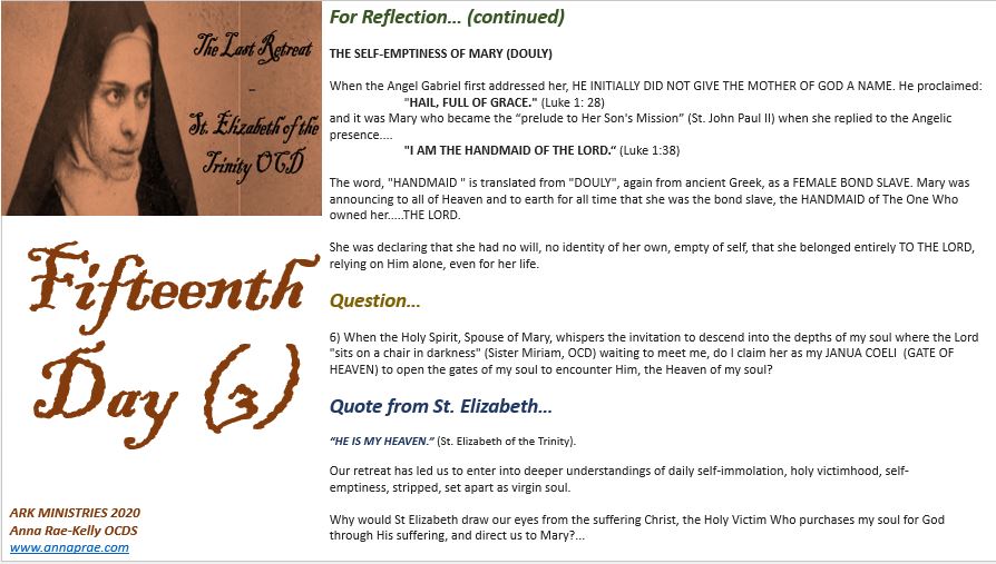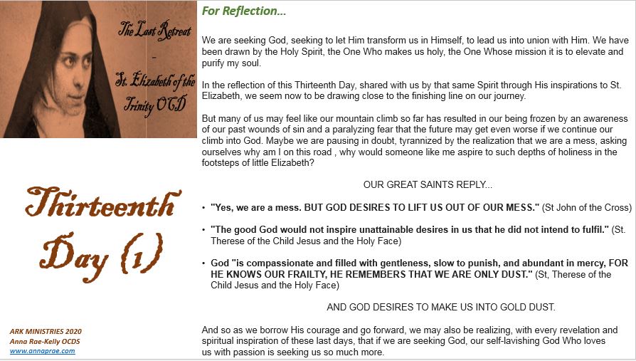 Holy Spirit: Spouse of Mary - Session 1 "You, O Mary, are the young plant that produced the fragrant flower of the Word, only begotten of God because you were the fertile land that was sown with His word." - St. Catherine of Siena "At the mention of this name, the angels rejoice and the devils tremble; through this invocation, sinners obtain grace and pardon." - St. Peter Canisius Quote One directs our thoughts to the source of all grace, the Spouse, the Holy Spirit Who filled Mary when He overshadowed her and she became the fertile soil. Quote 2 directs our thoughts to the power that flowed from God through Mary because she is "holy and without blemish (Ephesians 5): she is the "Panaghia" of the Orthodox Churches. And finally, we now move directly to the teacher who will guide us in this session, St. Maximilian Kolbe. "The Immaculate alone has from God the promise of victory over satan. She seeks souls that will consecrate themselves entirely to her, that will become in her hands forceful instruments for the defeat of Satan and the spread of God's Kingdom." Holy Spirit: Spouse of Mary - Session 2 What happens when we ask Mary to be our mother? She whispers to her Spouse and He overshadows us, pitches a tent around us...and the child begins to resemble the mother just as the mother resembled the child." Mary is the prototype of praying souls. Mary prayed ceaselessly because her desire for God was ceaseless. How deep is our desire for God? St. Augustine teaches us "… your desire is your prayer; if your desire is continuous then your prayer is continuous, because the Apostle did not say in vain: “pray constantly” (1 Thess 5:17). Do we constantly pray on our knees, prostrate our bodies or raise our hands to obey the order to “pray constantly”? If that’s what prayer means to us, then I think we cannot do it constantly. But there’s an interior prayer that goes on ceaselessly and that is desire. If you wish not to interrupt your prayer, never cease to desire. Your ceaseless desire will be your ceaseless prayer.” (St Augustine, On the Psalms) Mary's ceaseless prayer sanctified her state. She and her Spouse will teach us how to sanctify our state in life no matter what or where it is. They will help us to bring it into submission to God's Holy Will. They will help us to allow it to become the instrument to reach eternity. And they will teach us how to do all of this in love." Holy Spirit: Spouse of Mary - Session 3 In his book Witness to Hope, Pope John Paul II teaches us that the ideal of sanctity has already been programmed in Mary. Mary gives us a profile of what a disciple looks like. She was the ideal disciple before Christ was born so she shows us how the People of God should live. So, how should we live in the model of Mary? St. Therese of Lisieux gives us five of the most beautiful jewels in the heart of Mary: Her simplicity Her abandonment Her love for the Cross Her thirst for souls, and the diamond in the center: Her love. “It is because she is, of all the saints, the most perfectly poor and the most perfectly hidden, the one who has absolutely nothing whatever that she attempts to possess as her own, that she can most fully communicate to the rest of us the grace of the infinitely selfless God. And we will most truly posses Him when we have emptied ourselves and become poor and hidden as she is, resembling Him by resembling her. All our sanctity depends on her maternal love. The ones she desires to share the joy of her own poverty and simplicity, the ones whom she wills to be hidden as she is hidden, are the ones who share her closeness to God” – Thomas Merton, Understanding Catholic Devotion to Mary |